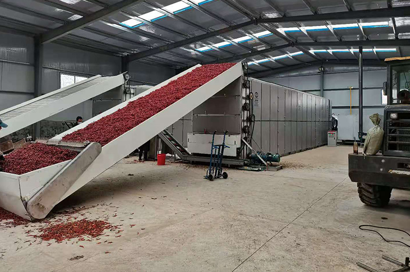辣椒烘干機由4個部分組成,分別是上料輸送機、網帶式烘干機主機、熱源、出料輸送機。轉換爐提供熱量;網帶式穿流干燥機是干燥設備的主體,由機體和多層輸送帶組成;電控系統控制整個設備的啟動、運轉與停止。