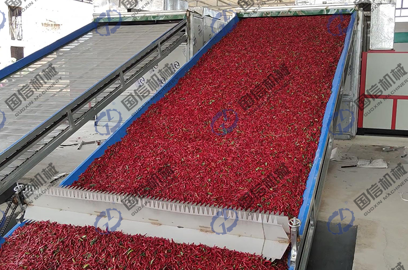國信廠家生產的大型辣椒烘干機是一種箱式結構,材質有烤漆、不銹鋼、彩鋼三種材質可供選擇。內部是由一層一層的不銹鋼網組成。辣椒經過輸送帶進入到烘干箱內部,在內部逐層的移動翻轉,密集的網孔用來輸送辣椒的同時還能透氣,使熱源產生的熱氣在透過網孔穿過物料層的時候帶走辣椒內部的水分。